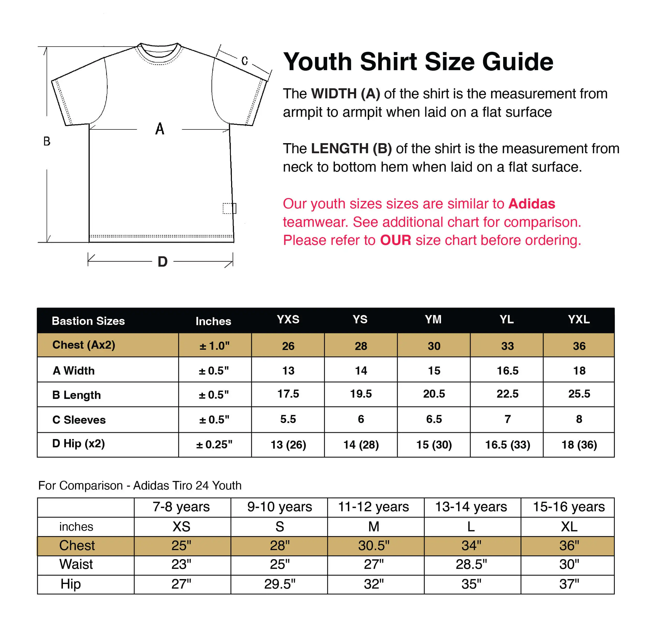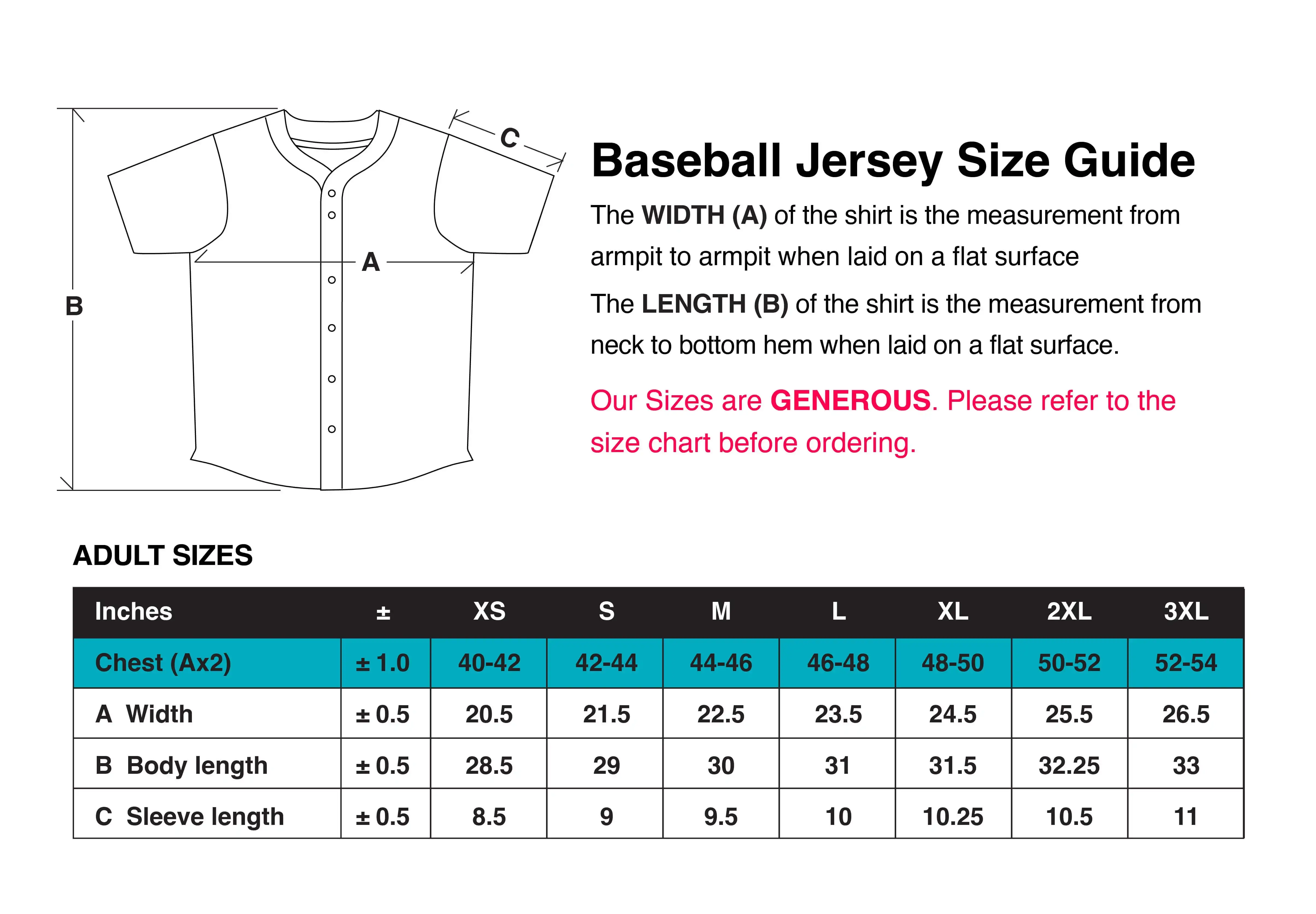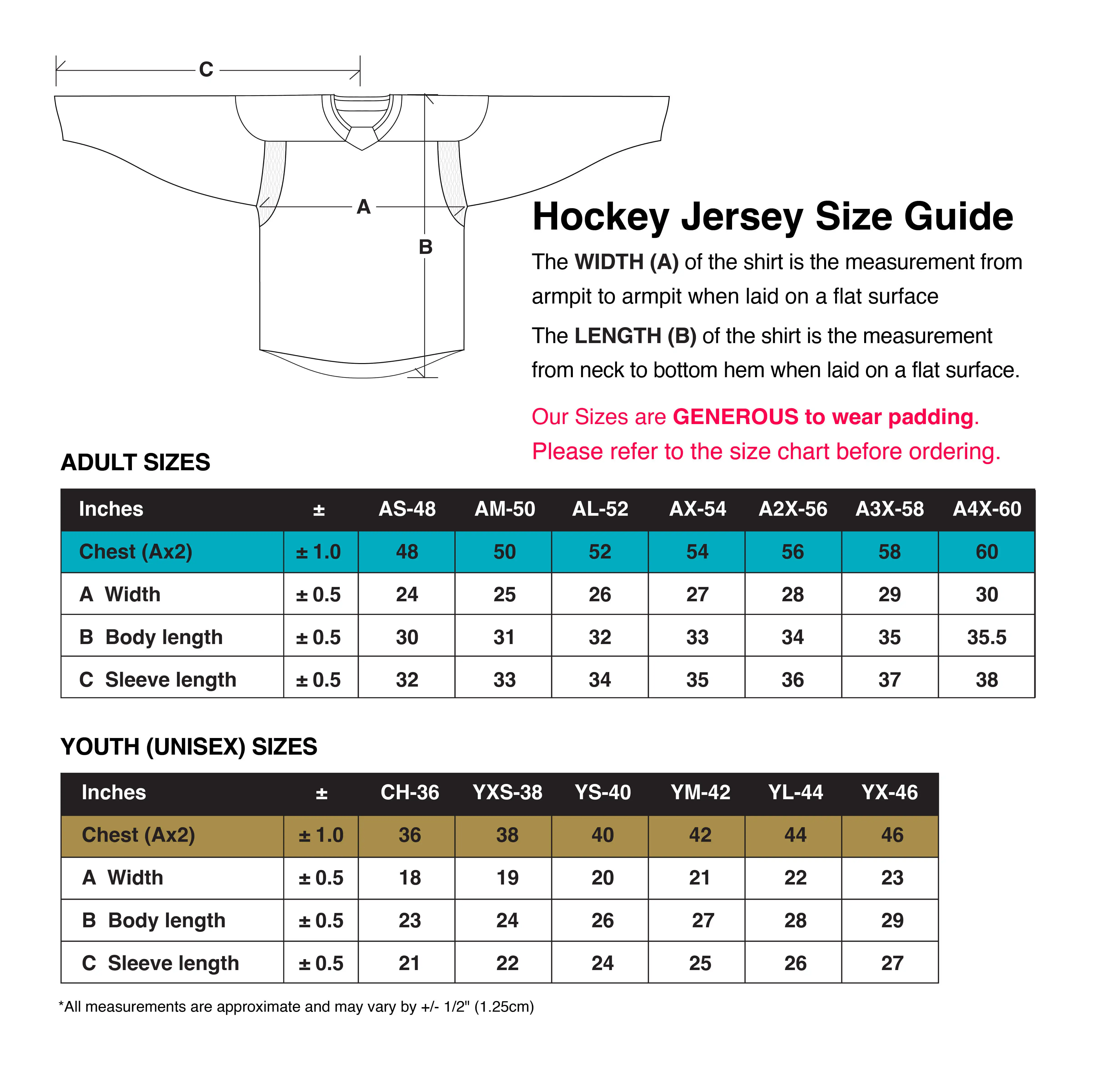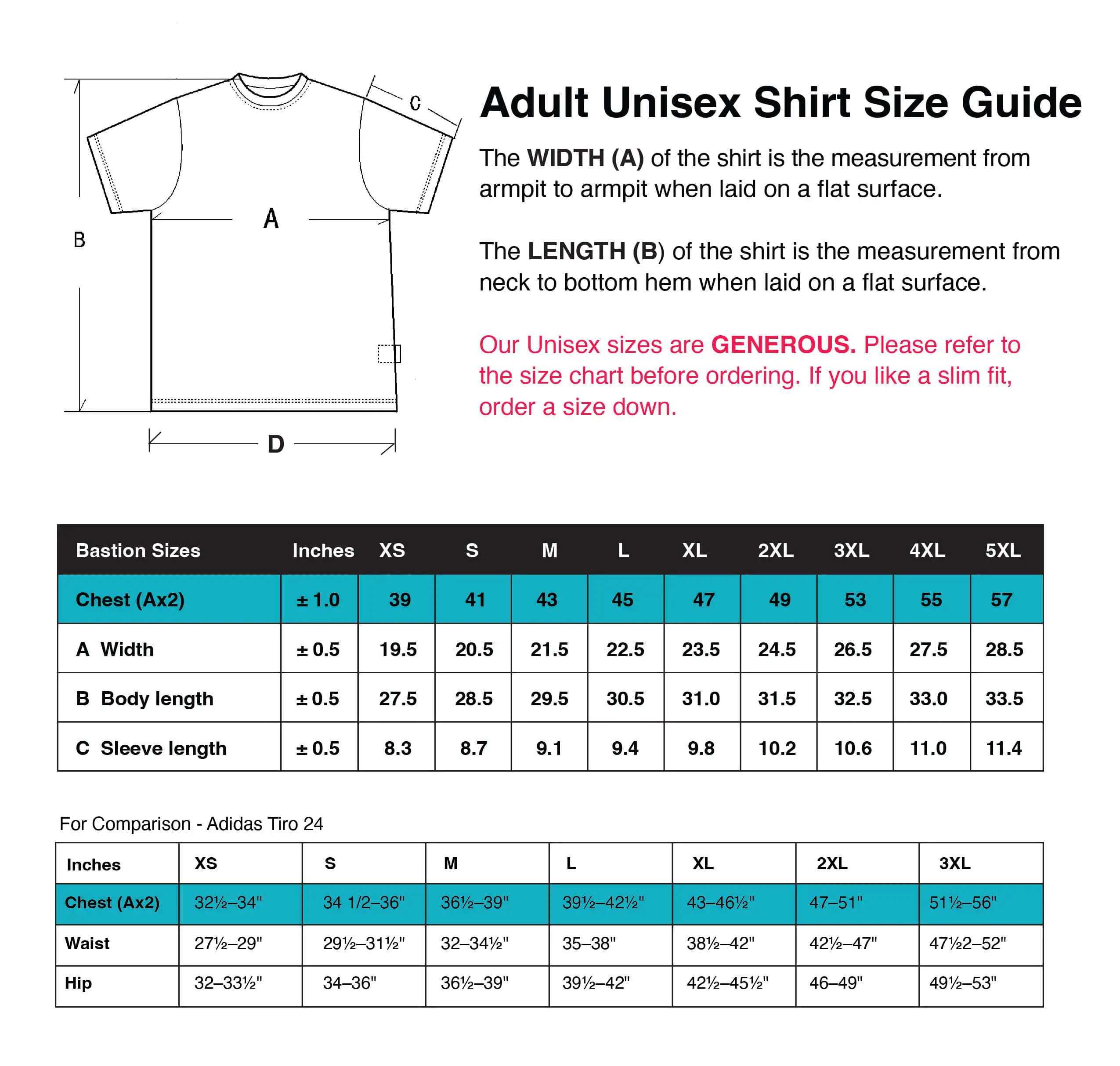 Our sizes are 'generous'. Please refer to the size charts before ordering. If you want a slimmer fit, size down. Many teams we make kits for are used to 'the brand with the three stripes' sizing so we have included comparison charts to help guide you.
